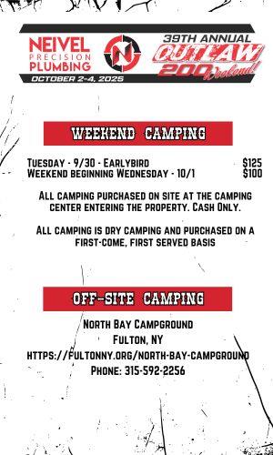 The preferred campground of Fulton Speedway is North Bay Campground located just four miles from the track in Fulton. North Bay is open for camping during Neivel Precision Plumbing Outlaw 200 Weekend and is also a great space to consider for Super DIRT Week.