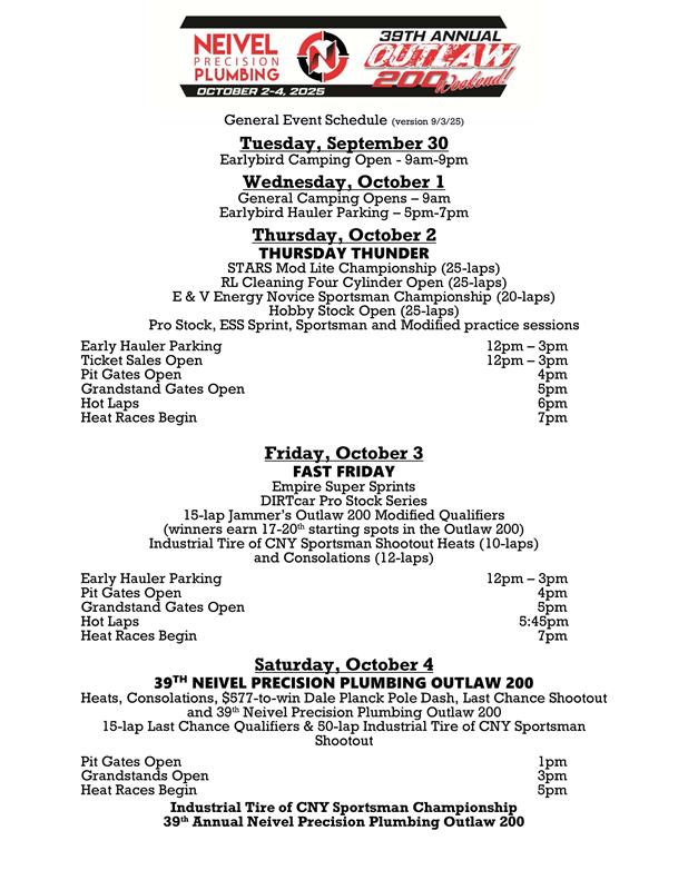FULTON, NY (October 2, 2025) - The 39th edition of Fulton Speedway’s prestigious Outlaw 200 Weekend roared to life on Thursday night, with four action-packed feature events. In the E&V Energy Novice Sportsman Outlaw Championship, Jacob Gurecki topped a field of 30 entries....more